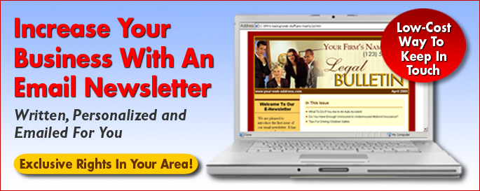 Attract new clients, expand services to clients and increase referrals with an email newsletter. These attractive newsletters are an excellent and low-cost way to keep your name in front of clients and referral sources and generate interest in your services. The articles are written by experienced lawyers and cover various topics, including personal injury, estate planning, business, real estate and family law.