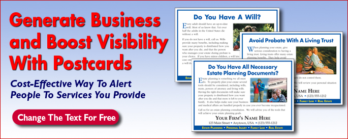 hese attractive postcards are an easy and inexpensive way to alert people about the importance of estate planning. They are ideal to send to current and former clients, potential clients, friends and referral sources. They remind recipients to prepare a will and engage in other forms of estate planning.