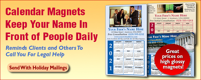 pn1Magnets remind people every day to call you for legal help. We offer a great price on these attractive calendar magnets, which come with your firm's name, address, phone number and areas of practice on them. Send calendar magnets to current and former clients, potential clients, friends and referral sources. Also include them in holiday mailings. People will appreciate the gift, and the magnets will keep your name and number easily accessible.