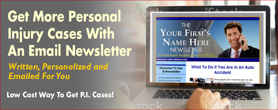 Get more p.i. cases with an email newsletter. These attractive newsletters are an easy and low-cost way to stay in touch with current and potential clients and referral sources and boost interest in your services. The articles are written by experienced lawyers and cover many areas of personal injury law, including what to do after an accident, accident victims' rights and the importance of using a lawyer for accident claims.
